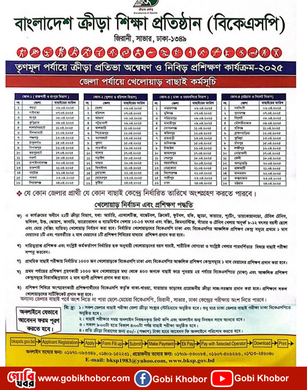 সেই সাথে কোনো বিষয়ে জানতে চাইলে বিকেএসপিতে যোগাযোগ করে জেনে নিতে পারেন। অনলাইন তথ্যের জন্য: ০১৬৭২-০৯৩৩৪৬, ০১৪০৬-১৫২২৩১, প্রয়োজনীয় তথ্যের জন্য: ০১৭০৯-৩৩০০৮৪, ০১৬০৭-৫০৬২৬৬, ০১৭১৩-২৪৬০৪০।