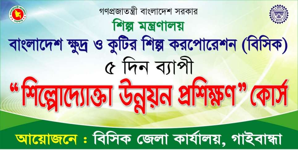 রানা পাপুল : বাংলাদেশ ক্ষুদ্র ও কুটির শিল্প করপোরেশন (বিসিক) গাইবান্ধা জেলা কার্যালয়ের উদ্যোগে পাঁচ দিনব্যাপী শিল্পোদ্যোক্তা উন্নয়ন প্রশিক্ষণের (ইডিপি) আয়োজন করা হয়েছে। গাইবান্ধা-পলাশবাড়ী সড়কের সদর উপজেলার বল্লমঝাড় ইউনিয়নের ধানঘড়া এলাকায় জেলা বিসিক কার্যালয়ে আগামী ২০ থেকে ২৪ এপ্রিল সকাল সাড়ে ৯টা থেকে বিকাল সাড়ে ৩টা পর্যন্ত চলবে এই প্রশিক্ষণ।